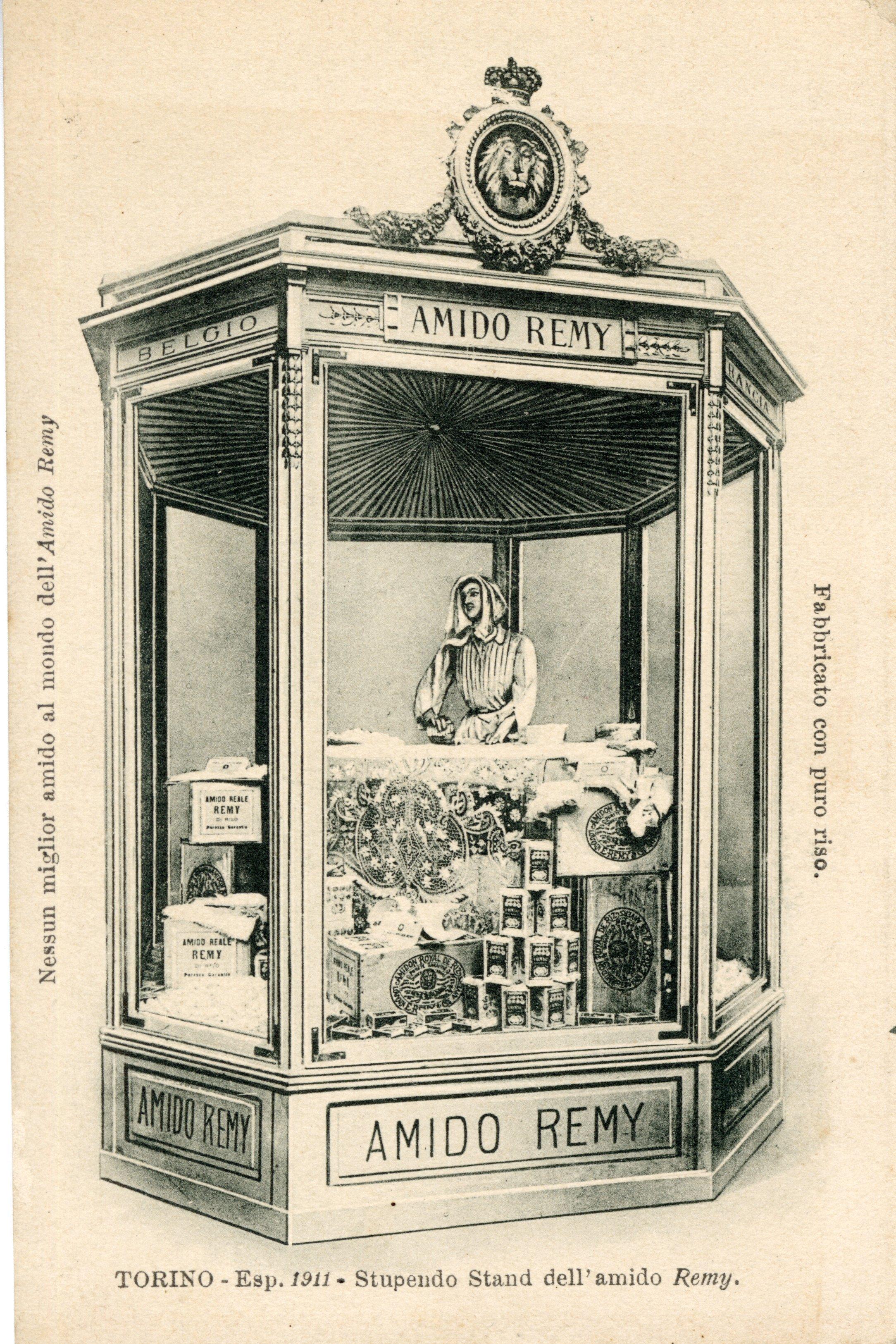 This black-and-white photo postcard shows the stand for the Remy brand of rice starch. In 1855 miller Eduard Remy bought a watermill in Wijgmaal, near the city of Leuven in Belgium and started milling rice grains to extract rice starch. This natural starch was broadly used to give clothing a crease-free finish, and to protect the fibres from dirt and wear. By the beginning of the 20th century, Remy was a world leader in the production and distribution of rice starch.