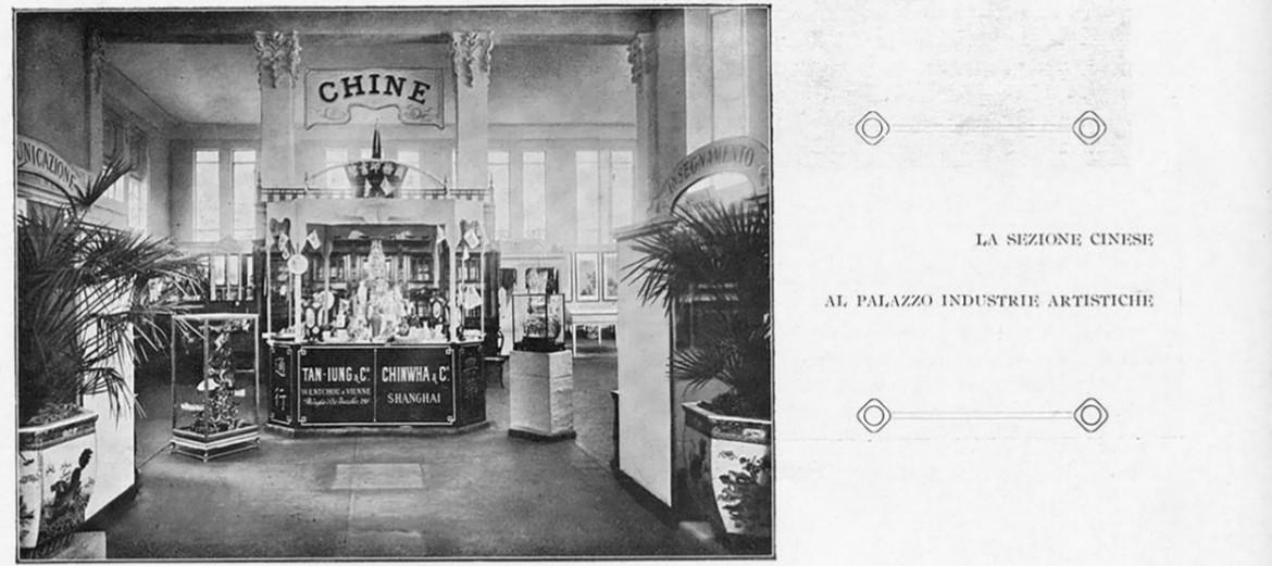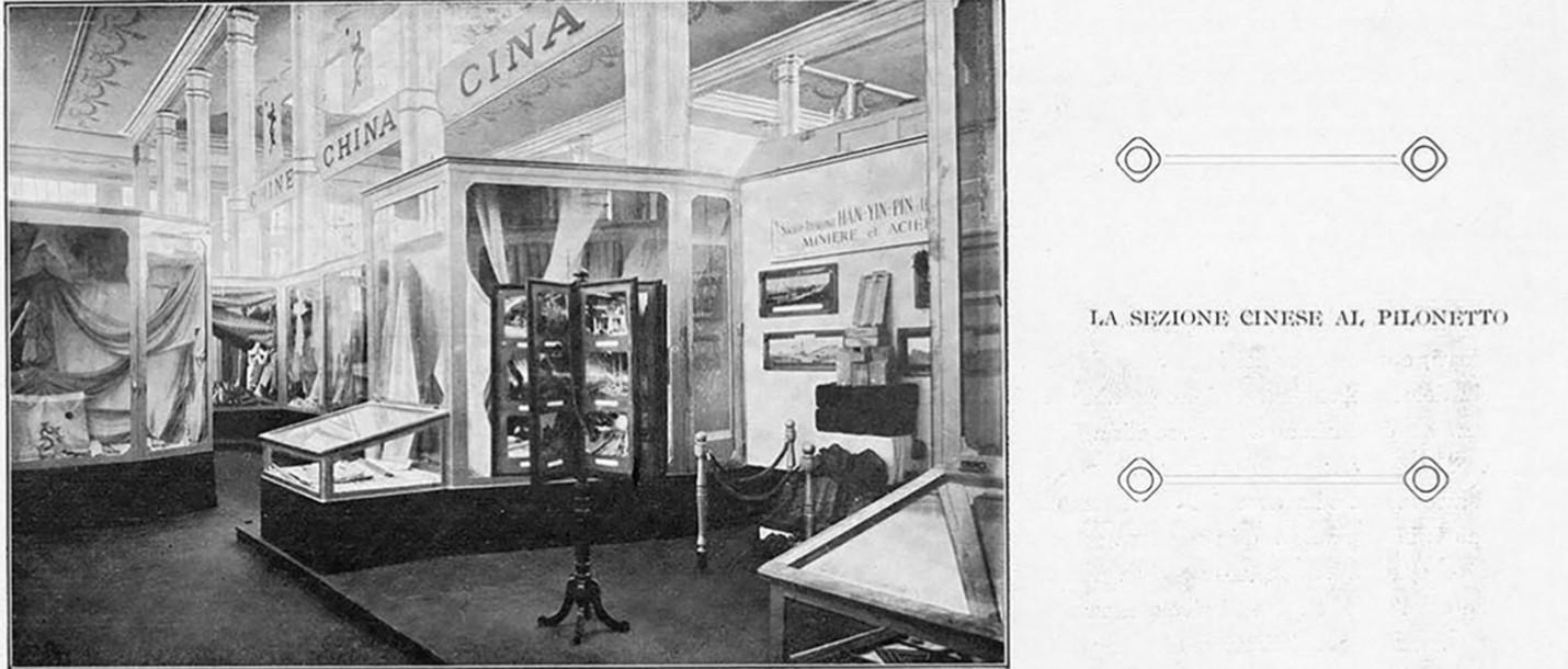 The exhibits devoted to China were in the Pavilion of the Arts Applied to Industry, the first main structure that visitors encountered upon entering the exposition from the Main Entrance at Umberto I Bridge. China was also present in the Pilonetto area, with exhibits devoted to the manufacture of silk.